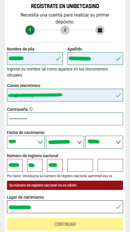Usa los links protegidos que ofrecemos para llegar sin problemas a la sección de inscripción de Unibet, esto te garantiza acceder al premio. Pulsa luego sobre el botón claro con texto “Crear cuenta”.
